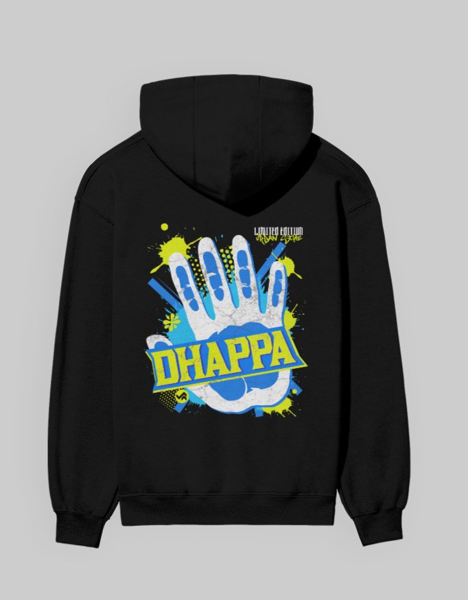 A bold, playful, street-inspired hoodie featuring striking blue handprints on the sleeves, a chest print, and a vibrant “DHAPPA” graphic on the back. Made using premium 300 GSM super-combed cotton fabric for everyday comfort and durability.